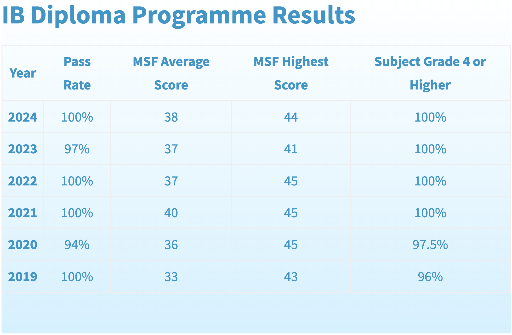 Metropolitan School Frankfurt is exceptional. It is warm and welcoming. It provides an excellent international education to 750 students from 55 countries while maintaining a family-like atmosphere. Large enough to offer a wide selection of teaching and learning opportunities, MSF is small enough to feel like home. It offers a safe, caring, and inspiring environment for students to thrive as independent thinkers, discover their strengths and develop skills to succeed, learn about the world around them, enjoy extracurricular activities, and form lasting friendships. As the result, we can be proud of 100% IB pass rate and 70% of our students have grades A/A* in IGCSE.